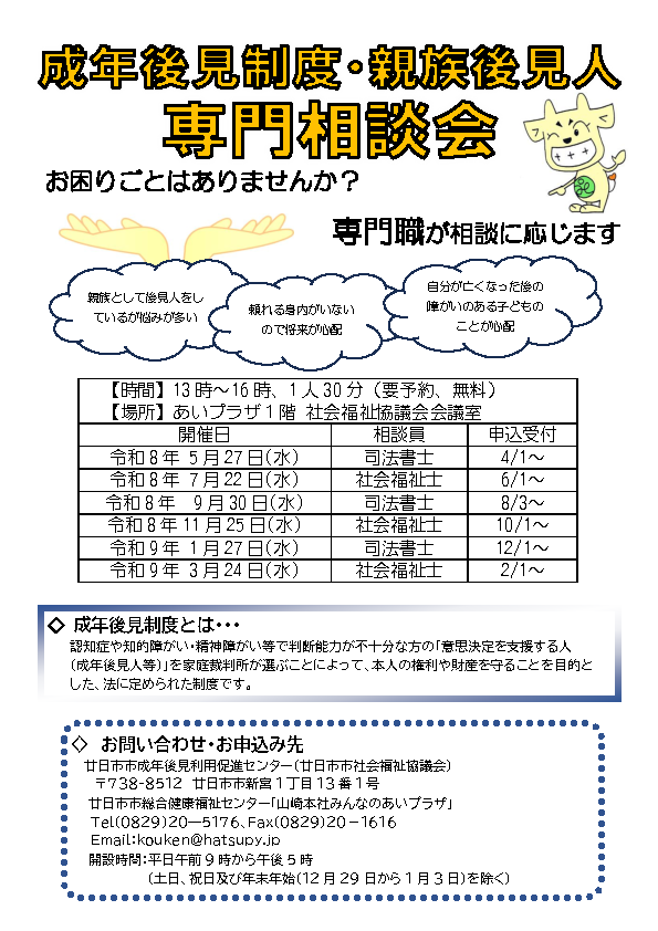 ご相談を希望される方は、廿日市市成年後見利用促進センター(TEL:0829-20-5176)までご連絡ください。